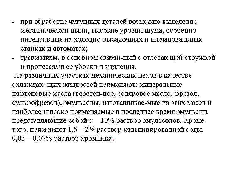 при обработке чугунных деталей возможно выделение металлической пыли, высокие уровни шума, особенно интенсивные на холодно высадочных и штамповальных станках и автоматах; травматизм, в основном связан ный с отлетающей стружкой и процессами ее уборки и удаления. На различных участках механических цехов в качестве охлаждаю щих жидкостей применяют: минеральные нафтеновые масла (веретен ное, соляровое масло, фрезол, сульфофрезол), эмульсолы, изготавливае мые из этих масел и наиболее широко применяемые в последнее время эмульсии, представляющие собой 5— 10% раствор эмульсолов. Кроме того, применяют 1, 5— 2% раствор кальцинированной соды, 0, 03— 0, 07% раствор хромпика.