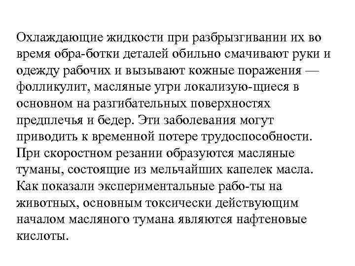 Охлаждающие жидкости при разбрызгивании их во время обра ботки деталей обильно смачивают руки и одежду рабочих и вызывают кожные поражения — фолликулит, масляные угри локализую щиеся в основном на разгибательных поверхностях предплечья и бедер. Эти заболевания могут приводить к временной потере трудоспособности. При скоростном резании образуются масляные туманы, состоящие из мельчайших капелек масла. Как показали экспериментальные рабо ты на животных, основным токсически действующим началом масляного тумана являются нафтеновые кислоты.
