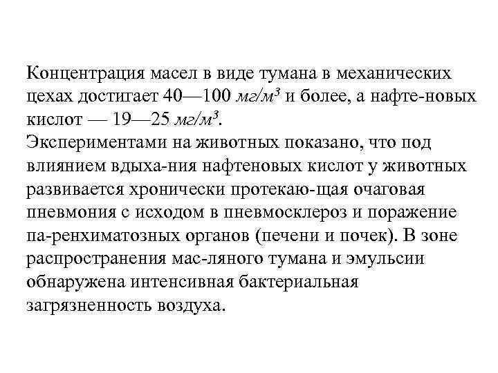 Концентрация масел в виде тумана в механических цехах достигает 40— 100 мг/м 3 и более, а нафте новых кислот — 19— 25 мг/м 3. Экспериментами на животных показано, что под влиянием вдыха ния нафтеновых кислот у животных развивается хронически протекаю щая очаговая пневмония с исходом в пневмосклероз и поражение па ренхиматозных органов (печени и почек). В зоне распространения мас ляного тумана и эмульсии обнаружена интенсивная бактериальная загрязненность воздуха.