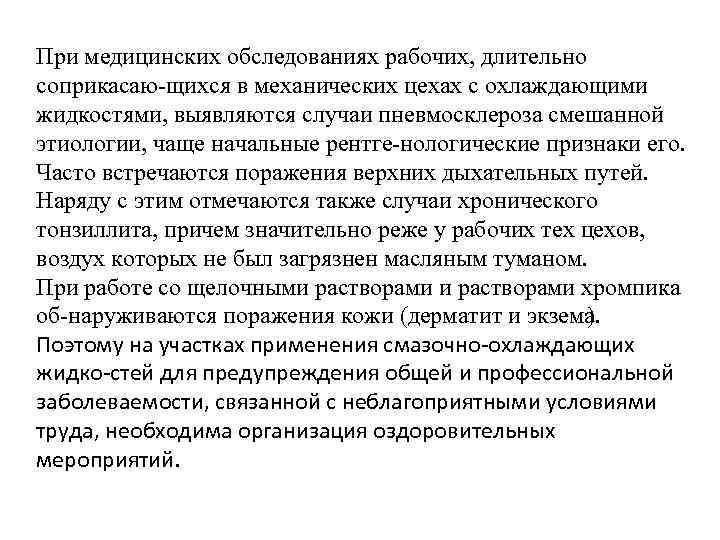 При медицинских обследованиях рабочих, длительно соприкасаю щихся в механических цехах с охлаждающими жидкостями, выявляются случаи пневмосклероза смешанной этиологии, чаще начальные рентге нологические признаки его. Часто встречаются поражения верхних дыхательных путей. Наряду с этим отмечаются также случаи хронического тонзиллита, причем значительно реже у рабочих тех цехов, воздух которых не был загрязнен масляным туманом. При работе со щелочными растворами хромпика об наруживаются поражения кожи (дерматит и экзема ). Поэтому на участках применения смазочно охлаждающих жидко стей для предупреждения общей и профессиональной заболеваемости, связанной с неблагоприятными условиями труда, необходима организация оздоровительных мероприятий.