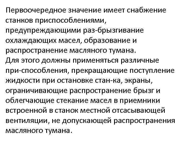 Первоочередное значение имеет снабжение станков приспособлениями, предупреждающими раз брызгивание охлаждающих масел, образование и распространение масляного тумана. Для этого должны применяться различные при способления, прекращающие поступление жидкости при остановке стан ка, экраны, ограничивающие распространение брызг и облегчающие стекание масел в приемники встроенной в станок местной отсасывающей вентиляции, не допускающей распространения масляного тумана.