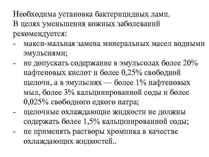 Необходима установка бактерицидных ламп. В целях уменьшения кожных заболеваний рекомендуется: макси мальная замена минеральных масел водными эмульсиями; не допускать содержание в эмульсолах более 20% нафтеновых кислот и более 0, 25% свободной щелочи, а в эмульсиях — более 1% нафтеновых мыл, более 3% кальцинированной соды и более 0, 025% свободного едкого натра; щелочные охлаждающие жидкости не должны содержать более 1, 5% кальцинированной соды; не применять растворы хромпика в качестве охлаждающих жидкостей. .