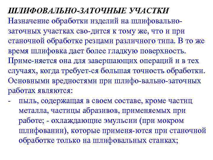 ШЛИФОВАЛЬНО-ЗАТОЧНЫЕ УЧАСТКИ Назначение обработки изделий на шлифовально заточных участках сво дится к тому же, что и при станочной обработке резцами различного типа. В то же время шлифовка дает более гладкую поверхность. Приме няется она для завершающих операций и в тех случаях, когда требует ся большая точность обработки. Основными вредностями при шлифо вально заточных работах являются: пыль, содержащая в своем составе, кроме частиц металла, частицы абразивов, применяемых при работе; охлаждающие эмульсии (при мокром шлифовании), которые применя ются при станочной обработке только на шлифовальных станках;