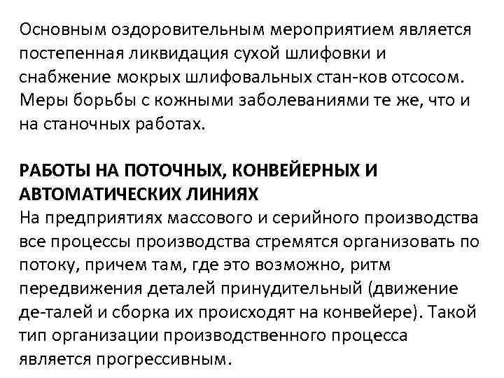 Основным оздоровительным мероприятием является постепенная ликвидация сухой шлифовки и снабжение мокрых шлифовальных стан ков отсосом. Меры борьбы с кожными заболеваниями те же, что и на станочных работах. РАБОТЫ НА ПОТОЧНЫХ, КОНВЕЙЕРНЫХ И АВТОМАТИЧЕСКИХ ЛИНИЯХ На предприятиях массового и серийного производства все процессы производства стремятся организовать по потоку, причем там, где это возможно, ритм передвижения деталей принудительный (движение де талей и сборка их происходят на конвейере). Такой тип организации производственного процесса является прогрессивным.