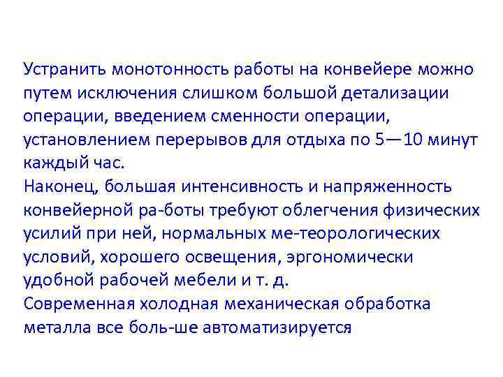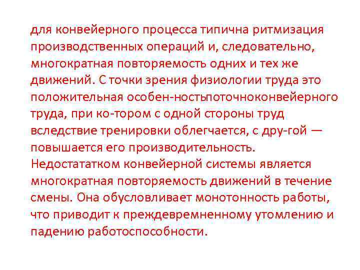 для конвейерного процесса типична ритмизация производственных операций и, следовательно, многократная повторяемость одних и тех же движений. С точки зрения физиологии труда это положительная особен ностьпоточноконвейерного труда, при ко тором с одной стороны труд вследствие тренировки облегчается, с дру гой — повышается его производительность. Недостататком конвейерной системы является многократная повторяемость движений в течение смены. Она обусловливает монотонность работы, что приводит к преждевремненному утомлению и падению работоспособности.