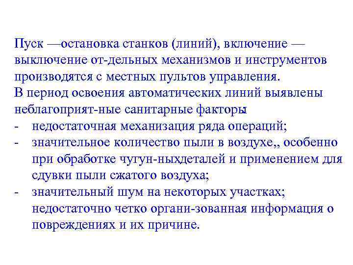 Пуск —остановка станков (линий), включение — выключение от дельных механизмов и инструментов производятся с местных пультов управления. В период освоения автоматических линий выявлены неблагоприят ные санитарные факторы : недостаточная механизация ряда операций; значительное количество пыли в воздухе, , особенно при обработке чугун ныхдеталей и применением для сдувки пыли сжатого воздуха; значительный шум на некоторых участках; недостаточно четко органи зованная информация о повреждениях и их причине.