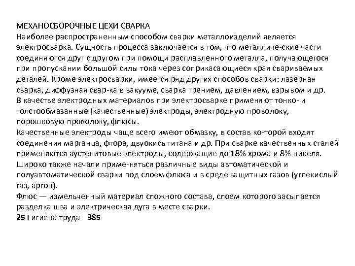 МЕХАНОСБОРОЧНЫЕ ЦЕХИ СВАРКА Наиболее распространенным способом сварки металлоизделий является электросварка. Сущность процесса заключается в том, что металличе ские части соединяются друг с другом при помощи расплавленного металла, получающегося при пропускании большой силы тока через соприкасающиеся края свариваемых деталей. Кроме электросварки, имеется ряд других способов сварки: лазерная сварка, диффузная свар ка в вакууме, сварка трением, давлением, взрывом и др. В качестве электродных материалов при электросварке применяют тонко и толстообмазанные (качественные) электроды, электродную проволоку, порошковую проволоку, флюсы. Качественные электроды чаще всего имеют обмазку, в состав ко торой входят соединения марганца, фтора, двуокись титана и др. При сварке качественных сталей применяются аустенитовые электроды, содержащие до 18% хрома и 8% никеля. Широко также начали приме няться различные виды автоматической и полуавтоматической сварки под слоем флюса и в среде защитных газов (углекислый газ, аргон). Флюс — измельченный материал сложного состава, слоем которого засыпается разделка шва и электрическая дуга в месте сварки. 25 Гигиена труда 385