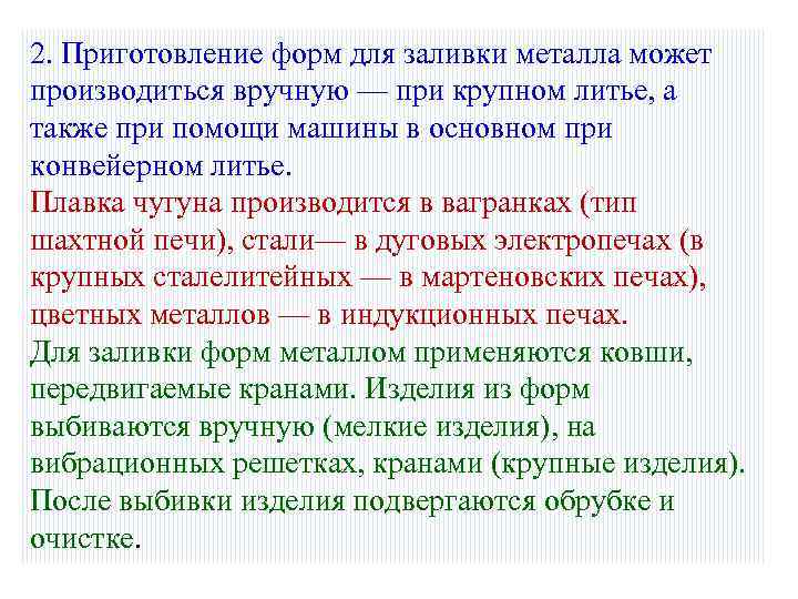 2. Приготовление форм для заливки металла может производиться вручную — при крупном литье, а также при помощи машины в основном при конвейерном литье. Плавка чугуна производится в вагранках (тип шахтной печи), стали— в дуговых электропечах (в крупных сталелитейных — в мартеновских печах), цветных металлов — в индукционных печах. Для заливки форм металлом применяются ковши, передвигаемые кранами. Изделия из форм выбиваются вручную (мелкие изделия), на вибрационных решетках, кранами (крупные изделия). После выбивки изделия подвергаются обрубке и очистке.