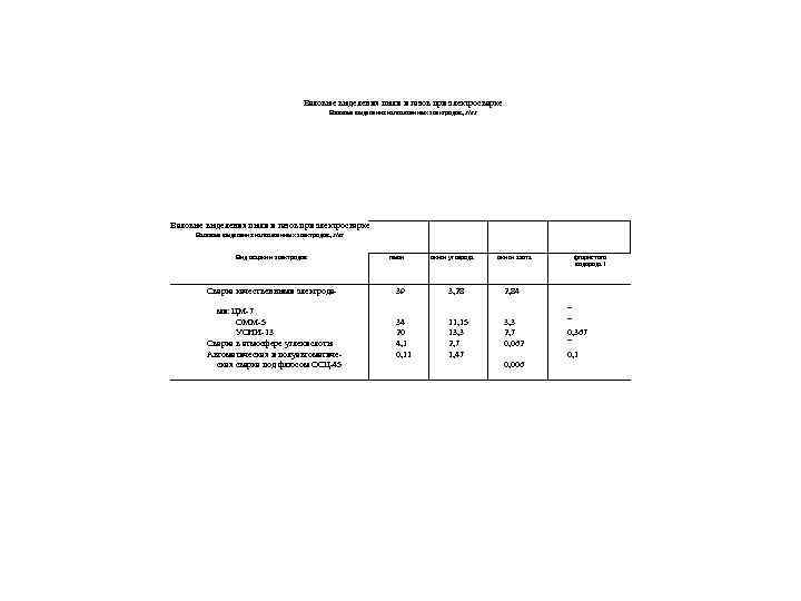 Валовые выделения пыли и газов при электросварке Валовые выделения наплавленных электродов, г/кг Вид сварки и электродов пыли окиси углерода окиси азота Сварка качественными электрода 39 3, 28 2, 84 ми: ЦМ 7 ОММ 5 УОНИ 13 Сварка в атмосфере углекислоты Автоматическая и полуавтоматиче ская сварка под флюсом ОСЦ 45 34 20 4, 1 0, 11 11, 15 13, 3 2, 7 1, 47 3, 3 2, 7 0, 062 фтористого водорода 1 — — 0, 367 — 0, 1 0, 006