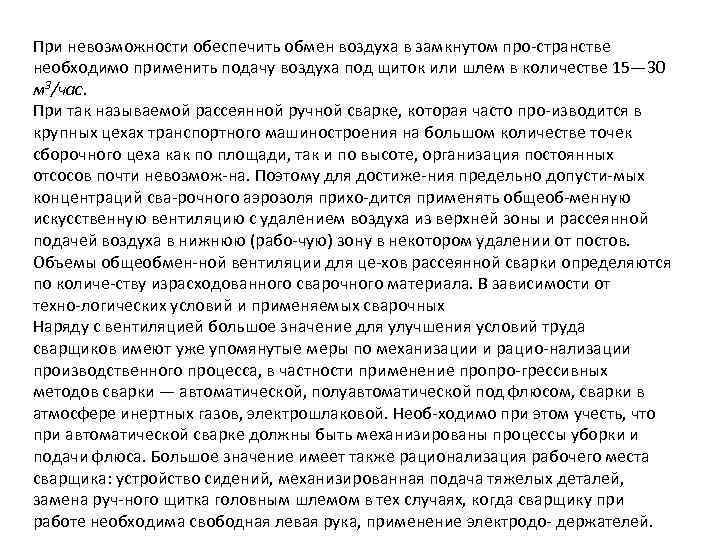 При невозможности обеспечить обмен воздуха в замкнутом про странстве необходимо применить подачу воздуха под щиток или шлем в количестве 15— 30 м 3/час. При так называемой рассеянной ручной сварке, которая часто про изводится в крупных цехах транспортного машиностроения на большом количестве точек сборочного цеха как по площади, так и по высоте, организация постоянных отсосов почти невозмож на. Поэтому для достиже ния предельно допусти мых концентраций сва рочного аэрозоля прихо дится применять общеоб менную искусственную вентиляцию с удалением воздуха из верхней зоны и рассеянной подачей воздуха в нижнюю (рабо чую) зону в некотором удалении от постов. Объемы общеобмен ной вентиляции для це хов рассеянной сварки определяются по количе ству израсходованного сварочного материала. В зависимости от техно логических условий и применяемых сварочных Наряду с вентиляцией большое значение для улучшения условий труда сварщиков имеют уже упомянутые меры по механизации и рацио нализации производственного процесса, в частности применение пропро грессивных методов сварки — автоматической, полуавтоматической под флюсом, сварки в атмосфере инертных газов, электрошлаковой. Необ ходимо при этом учесть, что при автоматической сварке должны быть механизированы процессы уборки и подачи флюса. Большое значение имеет также рационализация рабочего места сварщика: устройство сидений, механизированная подача тяжелых деталей, замена руч ного щитка головным шлемом в тех случаях, когда сварщику при работе необходима свободная левая рука, применение электродо держателей.