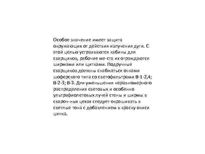 Особое значение имеет защита окружающих от действия излучения дуги. С этой целью устраиваются кабины для сварщиков, рабочие ме ста их ограждаются ширмами или щитками. Подручные сварщиков должны снабжаться очками шоферского типа со светофильтрами В 1 2, 4; В 2 3; В 3. Для уменьшения неравномерного распределения световых и особенно ультрафиолетовых лучей стены и ширмы в свароч ных цехах следует окрашивать в светлые тона с добавлением в краску окиси цинка.
