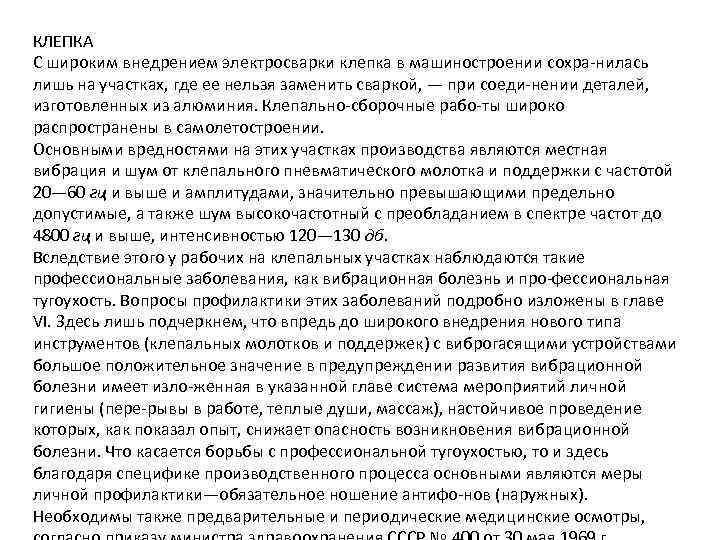 КЛЕПКА С широким внедрением электросварки клепка в машиностроении сохра нилась лишь на участках, где ее нельзя заменить сваркой, — при соеди нении деталей, изготовленных из алюминия. Клепально сборочные рабо ты широко распространены в самолетостроении. Основными вредностями на этих участках производства являются местная вибрация и шум от клепального пневматического молотка и поддержки с частотой 20— 60 гц и выше и амплитудами, значительно превышающими предельно допустимые, а также шум высокочастотный с преобладанием в спектре частот до 4800 гц и выше, интенсивностью 120— 130 дб. Вследствие этого у рабочих на клепальных участках наблюдаются такие профессиональные заболевания, как вибрационная болезнь и про фессиональная тугоухость. Вопросы профилактики этих заболеваний подробно изложены в главе VI. Здесь лишь подчеркнем, что впредь до широкого внедрения нового типа инструментов (клепальных молотков и поддержек) с виброгасящими устройствами большое положительное значение в предупреждении развития вибрационной болезни имеет изло женная в указанной главе система мероприятий личной гигиены (пере рывы в работе, теплые души, массаж), настойчивое проведение которых, как показал опыт, снижает опасность возникновения вибрационной болезни. Что касается борьбы с профессиональной тугоухостью, то и здесь благодаря специфике производственного процесса основными являются меры личной профилактики—обязательное ношение антифо нов (наружных). Необходимы также предварительные и периодические медицинские осмотры,
