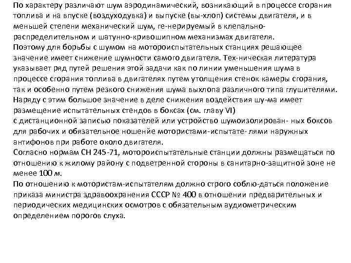 По характеру различают шум аэродинамический, возникающий в процессе сгорания топлива и на впуске (воздуходувка) и выпуске (вы хлоп) системы двигателя, и в меньшей степени механический шум, ге нерируемый в клепально распределительном и шатунно кривошипном механизмах двигателя. Поэтому для борьбы с шумом на мотороиспытательных станциях решающее значение имеет снижение шумности самого двигателя. Тех ническая литература указывает ряд путей решения этой задачи как по линии уменьшения шума в процессе сгорания топлива в двигателях путем утолщения стенок камеры сгорания, так и особенно путем резкого снижения шума выхлопа различного типа глушителями. Наряду с этим большое значение в деле снижения воздействия шу ма имеет размещение испытательных стендов в боксах (см. главу VI) с дистанционной записью показателей или устройство шумоизолирован ных боксов для рабочих и обязательное ношенйе мотористами испытате лями наружных антифонов при работе около двигателя. Согласно нормам СН 245 71, мотороиспытательные станции должны размещаться по отношению к жилому району с подветренной стороны в санитарно защитной зоне не менее 100 м. По отношению к мотористам испытателям должно строго соблю даться положение приказа министра здравоохранения СССР № 400 в отношении предварительных и периодических медицинских осмотров с обязательным аудиометрическим определением порогов слуха.