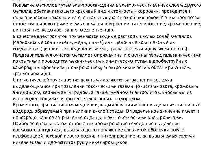 Гальваностегические покрытия Покрытие металлов путем электроосаждения в электрических ваннах слоем другого металла, обеспечивающего красивый вид и стойкость к коррозии, проводится в гальванических цехах или на специальных уча стках общих цехов. К этим процессам относятся широко применяемые в машиностроении никелирование, хромирование, цинкование, кадмиро вание, меднение и др. В качестве электролитов применяются водные растворы кислых солей металлов (сернокислые соли никеля, меди, цинка) или щелочные комплексные их соединения (цианистые соединения меди, цинка, кад мия и других металлов). Предварительная очистка металлов от ржавчины и окалины перед гальваническими покрытиями проводится механическим и химическим путем в дробеструйных камерах, шлифованием, полированием, электро химическим обезжириванием, травлением и др. С гигиенической точки зрения важными являются загрязнения воз духа выделяющимися при травлении токсическими газами: (окислами азота, хромовым ангидридом, серным ангидридом, а также туманом электролитов, уносимым из ванн выделяющимся в процессе электролиза водородом. Кроме того, при цианистом меднении, кадмировании может выделяться цианистый водород, образуемый при наличии кислой среды. Определенное значение имеет и непосредственное загрязнение одежды и рук токсическими электролитами. Наиболее опасны в этом отношении хромирование вследствие выделения хромового ангидрида, вызывающе го поражение слизистой оболочки носа с перфорацией носовой перего родки, и никелирование из за вызываемых солями никеля экзем и дер матитов рук у никелировщиков.