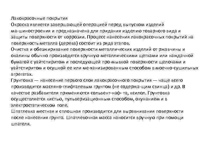 Лакокрасочные покрытия Окраска является завершающей операцией перед выпуском изделий ма шиностроения и предназначена для придания изделию товарного вида и защиты поверхности от коррозии. Процесс нанесения лакокрасочных покрытий на поверхность металла (дерева) состоит из ряда этапов. Очистка и обезжиривание поверхности металлических изделий от ржавчины и окалины обычно производятся вручную металлическими щетками или наждачной бумагой с уайтспиритом и последующей про мывкой поверхности щелочами и уайтспиритом и осушкой ее или ме ханизированным способом в моечно сушильных агрегатах. Грунтовка — нанесение первого слоя лакокрасочного покрытия — чаще всего производится масляно глифталевым грунтом (не содержа щим свинца) и др. В качестве разбавителя применяются сольвент наф та, ксилол. Грунтовка осуществляется кистью, пульверизационным способом, окунанием и в электростатическом поле. Шпатлевка местная и сплошная производится для выравнивания поверхности после нанесения грунта. Шпатлевочная масса наносится вручную при помощи шпателя.