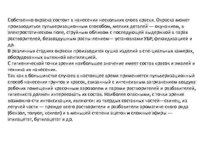 Собственно окраска состоит в нанесении нескольких слоев краски. Окраска может производиться пульверизационным способом, мелких деталей — окунанием, в электростатическом поле, струйным обливом с последующей выдержкой в парах растворителей, безвоздушным распы лением— установками УБР, флюидизацией и др. В различных стадиях окраски производится сушка изделий в спе циальных камерах, оборудованных вытяжной вентиляцией. С гигиенической точки зрения наибольшее значение имеет состав красок и эмалей и техника их нанесения. Так как в большинстве случаев в настоящее время применяется пульверизационный способ нанесения грунтов и красок, связанный с интенсивным загрязнением воздуха рабочих помещений красочным аэрозолем и парами растворителей и разбавителей, гигиениста должен интересовать их состав. Наиболее опасными, с точки зрения возможно сти интоксикации, являются: из твердых составных частей—свинец, из летучей части — прежде всего растворители и разбавители ароматиче ского ряда (бензол, толуол, ксилол) и в меньшей степени ацетон и сложные эфиры — этилацетат, бутилацетат и др.