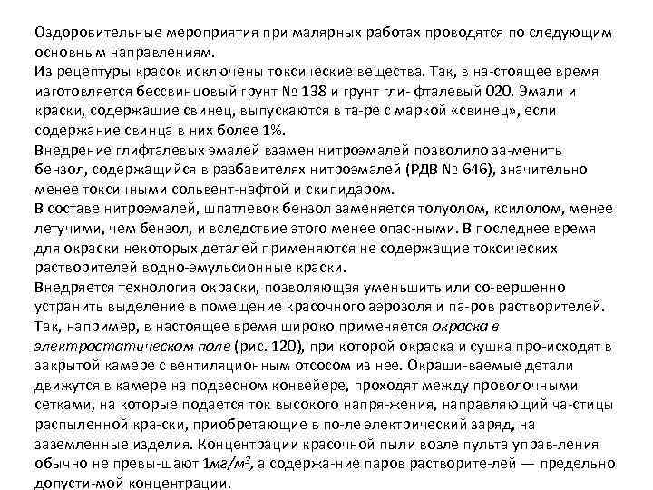 Оздоровительные мероприятия при малярных работах проводятся по следующим основным направлениям. Из рецептуры красок исключены токсические вещества. Так, в на стоящее время изготовляется бессвинцовый грунт № 138 и грунт гли фталевый 020. Эмали и краски, содержащие свинец, выпускаются в та ре с маркой «свинец» , если содержание свинца в них более 1%. Внедрение глифталевых эмалей взамен нитроэмалей позволило за менить бензол, содержащийся в разбавителях нитроэмалей (РДВ № 646), значительно менее токсичными сольвент нафтой и скипидаром. В составе нитроэмалей, шпатлевок бензол заменяется толуолом, ксилолом, менее летучими, чем бензол, и вследствие этого менее опас ными. В последнее время для окраски некоторых деталей применяются не содержащие токсических растворителей водно эмульсионные краски. Внедряется технология окраски, позволяющая уменьшить или со вершенно устранить выделение в помещение красочного аэрозоля и па ров растворителей. Так, например, в настоящее время широко применяется окраска в электростатическом поле (рис. 120), при которой окраска и сушка про исходят в закрытой камере с вентиляционным отсосом из нее. Окраши ваемые детали движутся в камере на подвесном конвейере, проходят между проволочными сетками, на которые подается ток высокого напря жения, направляющий ча стицы распыленной кра ски, приобретающие в по ле электрический заряд, на заземленные изделия. Концентрации красочной пыли возле пульта управ ления обычно не превы шают 1 мг/м 3, а содержа ние паров растворите лей — предельно допусти мой концентрации.