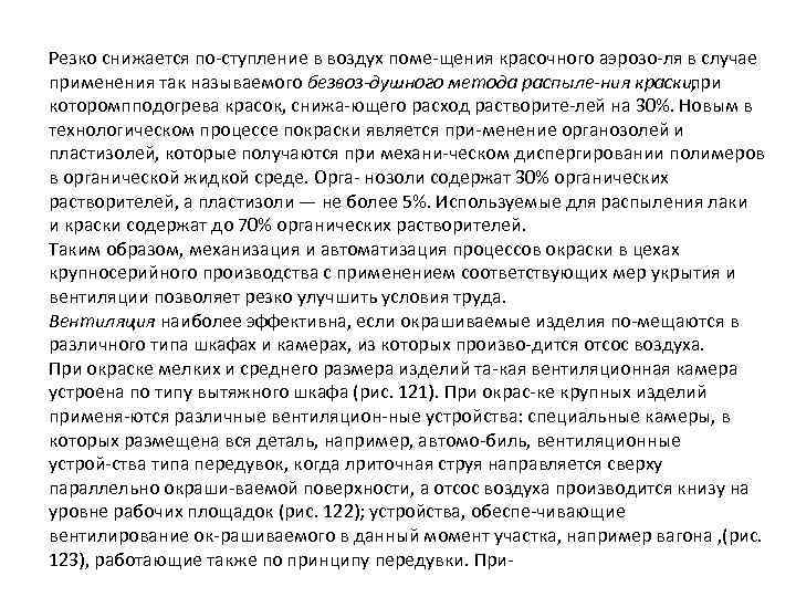 Резко снижается по ступление в воздух поме щения красочного аэрозо ля в случае применения так называемого безвоз душного метода распыле ния краски, при которомпподогрева красок, снижа ющего расход растворите лей на 30%. Новым в технологическом процессе покраски является при менение органозолей и пластизолей, которые получаются при механи ческом диспергировании полимеров в органической жидкой среде. Орга нозоли содержат 30% органических растворителей, а пластизоли — не более 5%. Используемые для распыления лаки и краски содержат до 70% органических растворителей. Таким образом, механизация и автоматизация процессов окраски в цехах крупносерийного производства с применением соответствующих мер укрытия и вентиляции позволяет резко улучшить условия труда. Вентиляция наиболее эффективна, если окрашиваемые изделия по мещаются в различного типа шкафах и камерах, из которых произво дится отсос воздуха. При окраске мелких и среднего размера изделий та кая вентиляционная камера устроена по типу вытяжного шкафа (рис. 121). При окрас ке крупных изделий применя ются различные вентиляцион ные устройства: специальные камеры, в которых размещена вся деталь, например, автомо биль, вентиляционные устрой ства типа передувок, когда лриточная струя направляется сверху параллельно окраши ваемой поверхности, а отсос воздуха производится книзу на уровне рабочих площадок (рис. 122); устройства, обеспе чивающие вентилирование ок рашиваемого в данный момент участка, например вагона , (рис. 123), работающие также по принципу передувки. При