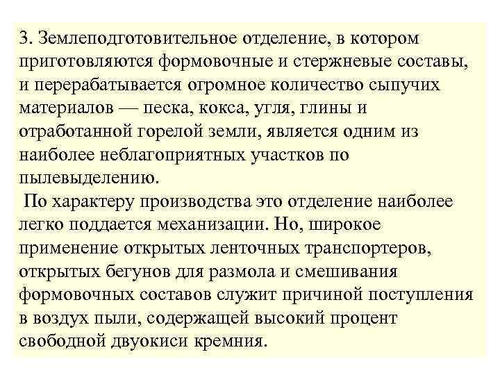 3. Землеподготовительное отделение, в котором приготовляются формовочные и стержневые составы, и перерабатывается огромное количество сыпучих материалов — песка, кокса, угля, глины и отработанной горелой земли, является одним из наиболее неблагоприятных участков по пылевыделению. По характеру производства это отделение наиболее легко поддается механизации. Но, широкое применение открытых ленточных транспортеров, открытых бегунов для размола и смешивания формовочных составов служит причиной поступления в воздух пыли, содержащей высокий процент свободной двуокиси кремния.