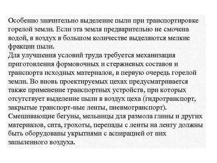 Особенно значительно выделение пыли при транспортировке горелой земли. Если эта земля предварительно не смочена водой, в воздух в большом количестве выделяются мелкие фракции пыли. Для улучшения условий труда требуется механизация приготовления формовочных и стержневых составов и транспорта исходных материалов, в первую очередь горелой земли. Во вновь проектируемых цехах предусматривается также применение транспортных устройств, при которых отсутствует выделение пыли в воздух цеха (гидротранспорт, закрытые транспорт ные ленты, пневмотранспорт). Смешивающие бегуны, мельницы для размола глины и других материалов, сита, грохоты, перепады с ленты на ленту должны быть оборудованы укрытиями с аспирацией от них запыленного воздуха.
