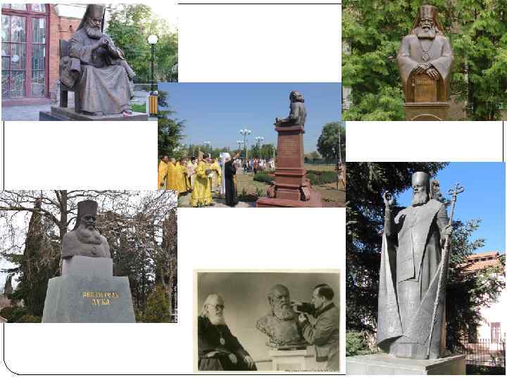 Памятники и учреждения носящие его имя 3 храма в Москве. Евпатория: храм во имя Святителя Луки Исповедника. : Ейск (Краснодарский край): храм во имя Святителя Луки] на территории Ейской центральной районной больницы. Екатеринбург: храм (строится) во имя Святителя и Исповедника Луки (Войно. Ясенецкого), архиепископа Крымского. Железногорск (Красноярский край): часовня святителя Луки Войно-Ясенецкого при клинической больнице № 51. Керчь: храм Святителя Луки. Симферополь: храм-часовня на территории Центральной клинической больницы им. Семашко. Ставрополь: храм на территории «Городской клинической больницы № 3» . пгт Романовка Саратовской области: улица, на ней установлена мемориальная доска Симферополь: — памятник в сквере Святителя Луки перед Представительством президента — памятник на территории 386 -го военного госпиталя Военно-медицинского клинического центра Крымского региона (установлен 2 июля 1997 г. , скульптор Ю. Г. Пустовита) — бюст-памятник и мемориальная доска в Симферопольском военном госпитале[175] — имя Святителя Луки (профессора В. Ф. Войно-Ясенецкого) присвоено Симферопольскому военному госпиталю — именем Святителя Луки назван сквер
