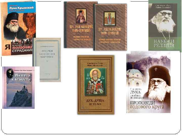 Избранные труды Случай ретроградного ущемления кишечной петли в паховой грыже» Хирургия, 1908 «Регионарная анестезия при операциях шеи, языка и верхней челюсти» Труды Московского хирургического общества, 1909 «Регионарная анестезия» Труды Тамбовского физиологического медицинского общества, 1909 «Кровяная саркома ребра» Хирургия, 1910 «Двустороннее повреждение блуждающего нерва» Хирургия, 1911 «Наш опыт лечения огнестрельного остеомиелита в госпиталях глубокого тыла» 1943 «Очерки гнойной хирургии» 2 -е изд. , 1943 «Поздние резекции при инфицированных огнестрельных ранениях суставов» Москва, 1944 Войно-Ясенецкий В. Ф. (Архиепископ Лука). Дух, душа и тело. — Брюссель: изд-во «Жизнь с Богом» , 1978. Войно-Ясенецкий В. Ф. (Архиепископ Лука). Наука и религия. — М. : Бином, 2006. Войно-Ясенецкий В. Ф. (Архиепископ Лука). Я полюбил страдание… Автобиография. — М. : издательство Сестричества во имя святителя Игнатия Ставропольского, 2008. —Войно-Ясенецкий В. Ф. (Архиепископ Лука). Слушайте писание. Проповеди на евангельские темы. — м. : Образ, 2007.