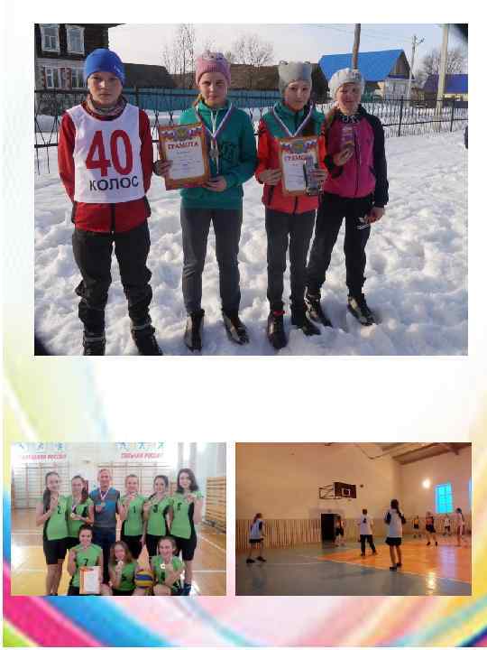 Открытое Первенство Вавожского района по лыжным гонкам на призы СХПК Колос. Соревнования по лыжным гонкам на призы СХПК «Колос» среди школьников, среди участников смотра-конкурса «Лыжня года» , эстафеты по лыжным гонкам и биатлону «Улица на улицу» , Вечерний командный спринт. Сказочные Веселые эстафеты с дошкольниками. Веселые старты «Папа, мама, я – спортивная семья» . Внутрихозяйственный турнир по лапте. Праздник окончания полевых работ «Гырон быдтон» : армрестлинг, гиревой спорт, волейбол, велогонки, перетягивание каната, соревнования удмуртских богатырей.