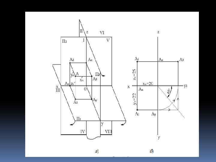 Пространственная модель координатных плоскостей проекций VI O – Origo начало Z II V VII I O X Y III VIII IV Плоскости проекций в Декартовой системе координат делят пространство на 8 частей – октантов