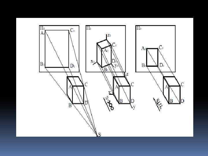 Параллельное проецирование Прямоугольное =900 Проецирование выполняют пучком параллельных лучей заданного направления S – угол, который составляет направление проецирования S с плоскостью проекций S // // Косоугольное 900 // = 350 (применяется при построении теней) A 2 S l 2 A // l x A 1 A 2 z l 1 35 о x О 35 о y A 1 l 2 45 о l 1