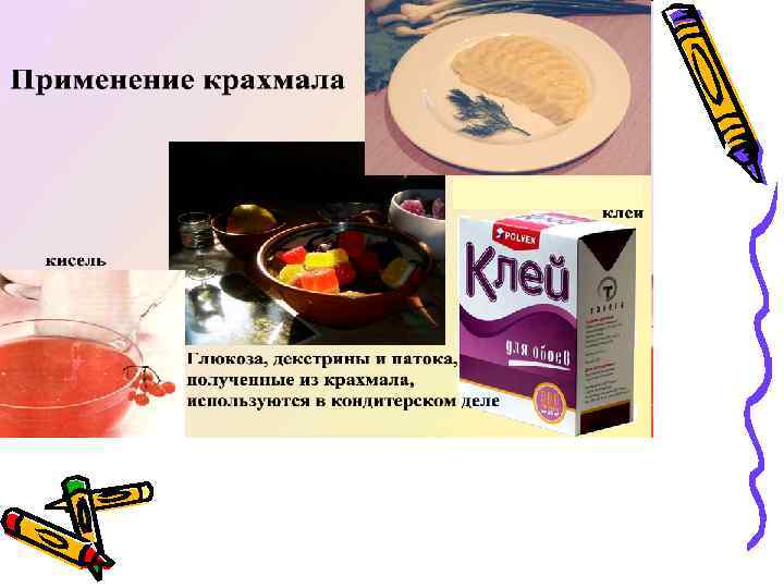 Крахмал применяется в пищевой текстильной бумажной химической резиновой фармацевтической парфюмерной промышленности