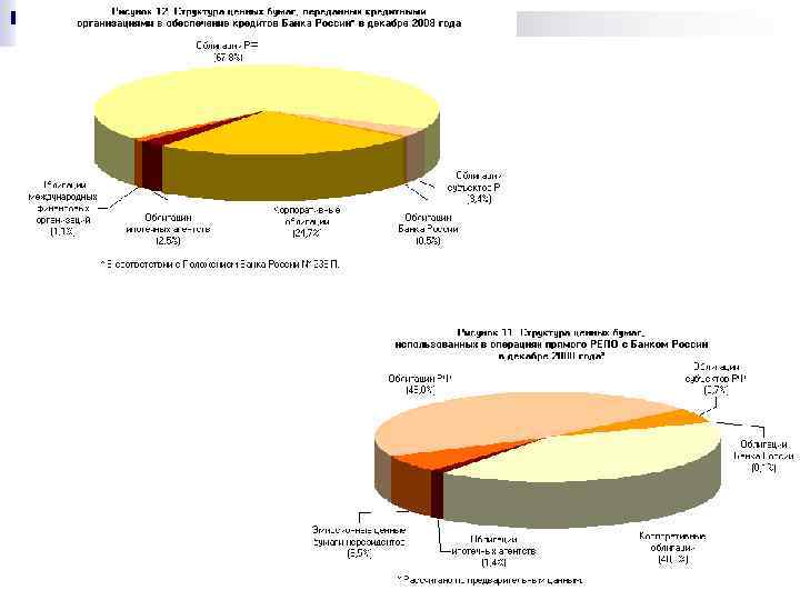 ЦБ РФ Помимо кредитов широкое распространение получили операции прямого РЕПО (соглашения об обратном выкупе) — соглашения, по которому одна сторона сначала продает другой стороне (в данном случае Банку России) ценную бумагу, а по истечении определенного, оговоренного договором срока выкупает ее по заранее установленной цене. Объем этих операций за 2007 г. составил 1, 5 трлн. руб. Средневзвешенные процентные ставки на аукционах прямого РЕПО с Банком России в 2007 г. находились в диапазоне от 6, 0 до 7, 2%. С учетом сформировавшегося спроса кредитных организаций на денежные средства Совет директоров Банка 14 ноября 2005 г. принял решение об увеличении лимита по операциям прямого РЕПО на срок до 5 дней до 150 млрд. руб. В октябре 2005 г. кредитные организации обратились к операциям «валютный своп» [1] как дополнительному инструменту рефинансирования в условиях недостатка ликвидности в период налоговых платежей. Под операциями «своп» понимается покупка и продажа валюты на условиях «спот» [2] с одновременным заключением обратной форвардной сделки. [1] Своп (англ. swap) — операция по обмену активами между сторонами сделки в целях снижения процентного или валютного риска. [2] Спот (англ. spot) — класс сделок на наличный актив на условиях его немед ленной оплаты и поставки.