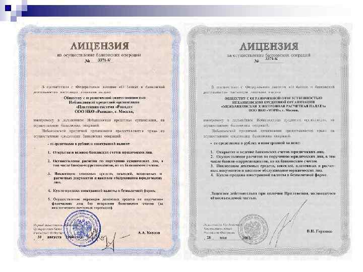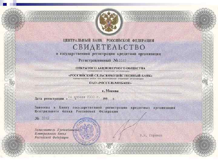 ЦБ РФ Банк России принимает решение о государственной регистрации кредитных организаций и ведет Книгу государственной регистрации кредитных организаций, выдает кредитным организациям лицензии на осуществление банковских операций, приостанавливает действие этих лицензий и отзывает их. На получение банковской лицензии могут претендовать только структуры, сформировавшие уставный капитал в необходимом размере. Законом от 3 мая 2006 г. № 60 -ФЗ, вступившим в силу с 1 января 2007 г. , минимальный размер уставного капитала банка определен эквивалентом 5 млн. евро, а небанковской кредитной организации — 0, 5 млн. евро. Формирование уставного капитала за счет заемных средств не допускается. Доля денежной части уставного капитала не должна быть меньше 80%. Виды лицензий Банка России (Инструкция от 14 января 2004 г. № 109 И): n лицензия на право проведения всех банковских операций в рублях, кроме привлечения вкладов населения, n лицензия на право проведения всех банковских операций в валюте, кроме привлечения вкладов населения, n лицензию на проведение операций с драгоценными металлами. При выдаче банковской лицензии Банк России осуществляет проверку учредителей.
