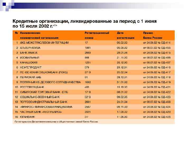 Банковская система РФ По организационно правовой форме российская практика знает два основных вида банков: паевые и акционерные — открытого и закрытого типа. В зависимости от источников формирования капитала банки могут быть с участием иностранного капитала или без участием иностранного капитала. Современная банковская система РФ пережила уже несколько крупных кризиса. Первый, в августе 1995 г. , выразился в крахе межбанковского кредитного рынка и неспособности многих банков рассчитаться по своим обязательствам. Второй начался в августе 1998 г. Для него была характерна потеря ликвидности наиболее крупными банками, приостановка безналичных расчетов, потеря доверия к банковской системе со стороны населения. (В. Геращенко, принявший руководство Банком России после этого кризиса, заявил, что потери российской банковской системы в результате финансового кризиса 1998 г. составили 100 млрд. руб. По его словам, реальные активы банков сократились на 25%, а нехватка высоколиквидных активов составила 22 млрд. руб. — почти 40% от необходимого объема. Кризис был настолько глубоким, что был преодолен только к концу 2000 г. ) Следующий кризис начался в августе 2009 г. Кризисы кредитной системы породили недоверие к российской кредитной системе. Россияне предпочитали тезаврировать свои накопления, а не размещать их на счетах коммерческих банков. Для защиты прав вкладчиков, укрепления доверия к банковской системе, привлечения сбережений населения был принят Закон о страховании вкладов физических лиц в банках РФ от 23 декабря 2003 г. № 177 ФЗ.