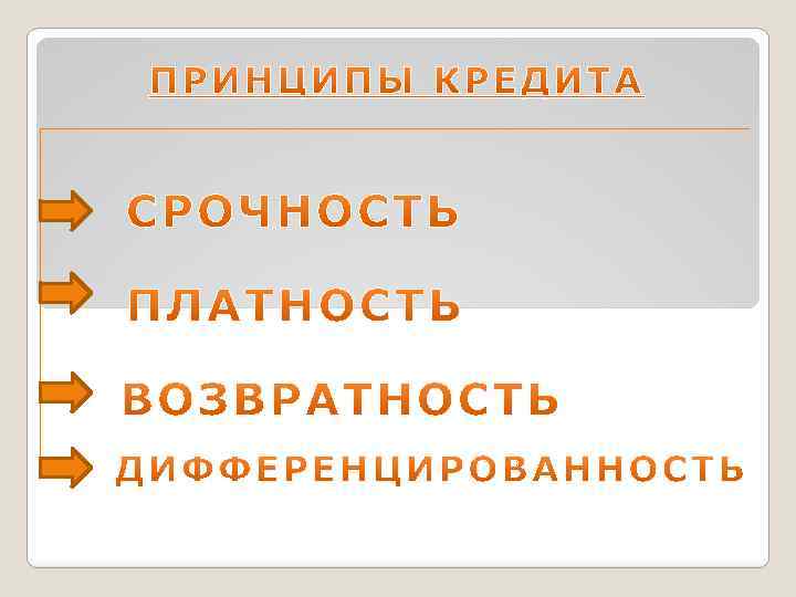 Принцип срочности заключается в том, что кредит должен быть возвращен в строго определенные сроки. Соблюдение этого принципа — важное условие функционирования банков и самой кредитной системы. Возвратность означает, что кредит должен быть возвращен. Принцип платности означает, что за взятые в кредит деньги, надо платить процент. Платность заставляет заемщика эффективное использовать заемные средства. Принцип дифференцированности кредита означает, что процентные ставки по кредитам зависят от вида, срока и целевой направленности кредита.