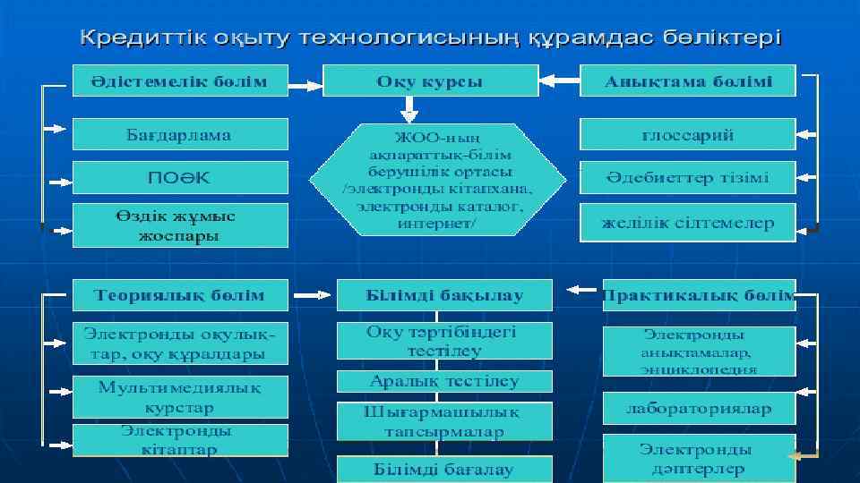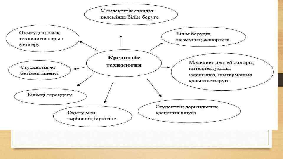 ЖОО оқытудың кредиттік жүйесін енгізудің мақсаттары мен міндеттері төмендегідей ü - барлық отандық білім беру жүйесін оқытудың дүниежүзілік жүйесіне бірік-тіруді жеделдету; ü - білім беру стандарттарын жоспар-лау икемділігін талаптармен ыңғайлап біріктіру; ü - оқу пәнін таңдаудың академиялық еркіндігі; ü - әдістемелік құжаттардың бірыңғай жүйесін құру және оны үнемі жетілдіру; ü - баллдық және әріптік бағалауға көшу; ü - академиялық профессор, профес-сордың ассистенті сияқты профессорлық-оқытушы құрамының жалпы дүниежүзі бойынша мойындалған қызметтерін енгізу, сонымен қатар арнайы академиялық қызмет – тіркеуші кеңсесін (офис регистратора) құру; ü - кафедраның оқу жүктемесін жоспарлау үшін жаңа негіздер құру; ü - оқу үрдісін ұйымдастырудың принциптерін өзгерту; ü - студенттер ұжымын, топтарын қалыптастырудың механизмін жетілдіру; ü - оқу үрдісін ақпараттандыру деңгейін көтеру; ü - базалық оқу курсы бойынша студенттерді электронды немесе баспа түріндегі оқулықтармен және оқу материалдарымен қамтамасыз ету.