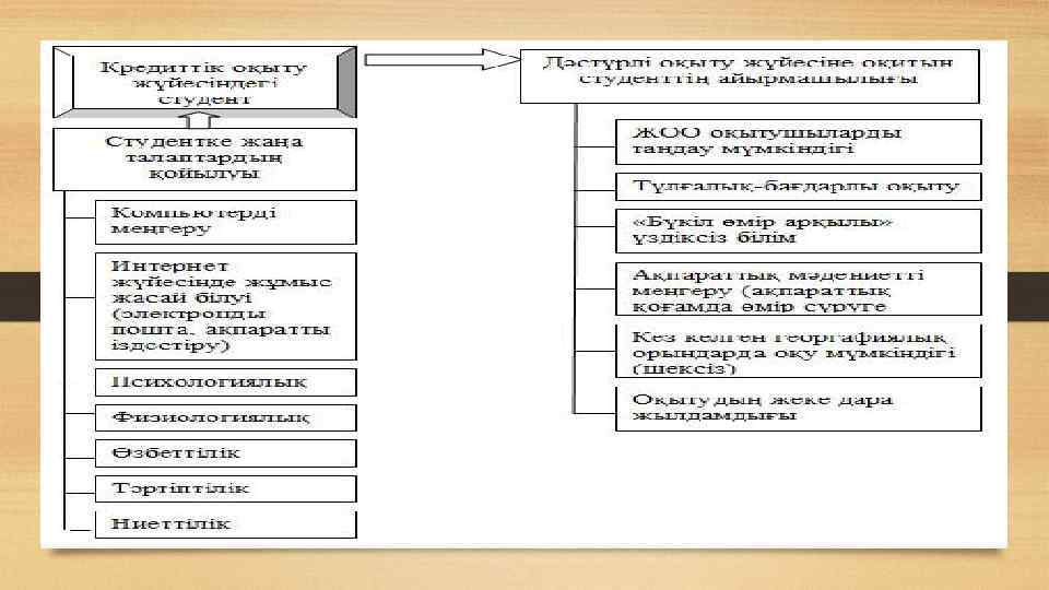 • Қазақстан Республикасында кредиттік оқу жүйесі 19 ғасырдың 90 - шы жылдарының ортасынан біртіндеп қалыптаса бастады. Елімізде 2007 жылы 15 тамызда «Білім туралы» жаңа заң қабылданды. Осы заңның 11 бабында білім жүйесі мәселелерінің бірі болып оқытуда жаңа технологияларды тиімді пайдалану және енгізу, сонымен қатар кредиттік, дистанциялық, ақпараттық-коммуникациялық оқыту кәсіби білімнің қоғамда және еңбек нарығында болып жатқан өзгерістер қажеттілігіне тез үйлесуге мүмкіндік туғызатыны атап көрсетілген. Қазақстан Республикасының «Білім туралы» Заңын іске асыру мақсатында № 66 -шы «кредиттік оқыту технологиясы бойынша оқу процесін ұйымдастыру ережесі» әзірленген және бекітілген. Кредиттік оқыту технологиясы — бұл білім беру технологиясы, өз бетімен білім алу деңгейін көтеру және дара негізінде шығармашылық білімді меңгеру, оқу процесін және білім көлемін кредит негізінде есепке алуды, білім беруді таңдап алған траекториясын регламенттеу болып табылады