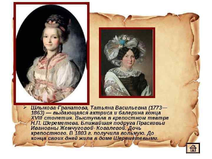 Прасковья Жемчугова Прекрасному голосу и артистическому таланту П. И. Ковалевой-Жемчуговой шереметевский театр был обязан своим процветанием. Последний раз она вышла на сцену останкинского театра в опере А. Э. Гретри «Браки самнитян» , показанной в 1797 г. для императора Павла I. Ковалева. Жемчугова в этом спектакле исполняла роль храброй девушки Элианы, ради любимого юноши Парменона переодевшейся воином и спасшей в бою военачальника. В костюме Элианы Жемчугову изобразил неизвестный художник