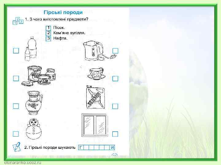 Які з гірських порід використовують у будівництві? Якою гірською породою ви пишете на дошці? З якої гірської породи виготовляють грифель олівця? Яку гірську породу додають для смаку у різні страви? З якої гірської породи діти споруджують замки на березі моря? Яку гірську породу використовують для облицювання станцій метро? З якої гірської породи роблять посуд? Як називають людей, які займаються пошуком гірських порід?
