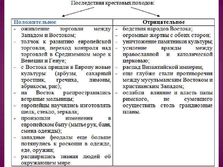 Участники крестовых походов и их цели: Участники Цели Результаты Католическая церковь Распространение влияния христианства на Авторитета крестовые Восток. походы церкви не добавили. Расширение земельных владений и увеличение Земли не получила. числа налогоплательщиков. Короли Поиски новых земель в целях расширения королевского войска и влияния королевской Усилилась тяга к красивой власти. жизни и роскоши. Герцоги и графы Обогащение и расширение земельных владений. Изменения в быту. Включение в торговлю. Заимствование восточных изобретений и культур. Рыцари Поиски новых земель. Города (Италия) Установление контроля за Купцы Средиземном море. Интерес к торговле с Востоком. Крестьяне Поиски свободы и собственности. торговлей Многие погибли. Земли не получили. в Оживление торговли и установление контроля Генуи и Венеции над торговлей в Средиземном море. Гибель людей.