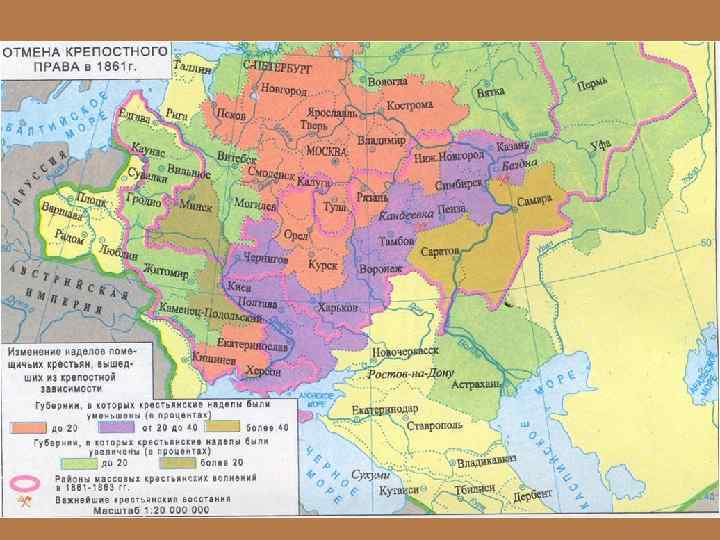 Итоги реформы: • Было освобождено от крепостной зависимости 23 млн. помещичьих крестьян. • В среднем по России крестьяне получили по 3, 3 десятины на мужчину. • У крестьян отрезали до 20% земель, бывших в их пользовании до реформы.