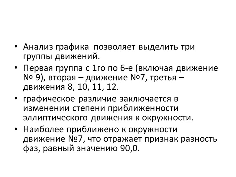 Анализ графика позволяет выделить три группы движений. Первая группа с 1го по 6-е (включая движение № 9), вторая – движение №7, третья – движения 8, 10, 11, 12. графическое различие заключается в изменении степени приближенности эллиптического движения к окружности. Наиболее приближено к окружности движение №7, что отражает признак разность фаз, равный значению 90,0.