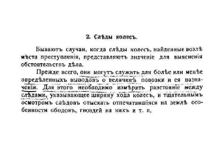 Иллюстрация • • • 1 – брызги и грязь при переезде через лужу; 2 – примятая трава; 3 – отложения пыли и снега в виде веера; 4 – сломанные при переезде колесами ветки; 5 – углы расхождения (а) и углы схождения (б) при повороте; 6 – рельеф дна следа на мягком грунте; 7 – капли жидкости, упавшие с транспортного средства; 8 – зазор при переезде через камень; 9 – углы рисунка протектора.