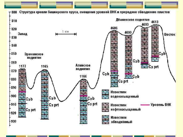Обычно конфигурация зон, где в продуктивном пласте способность к фильтрации уничтожена, может принимать самые причудливые формы. Например, рассмотрим продуктивный разрез бобриковских отложений в пределах Азнакаевской площади. Из рисунка видно, что уровни ВНК не совпадают с границами проницаемых пластов, а участки окремненя частично замещают продуктивный коллектор. Наиболее вероятной причиной прорыва покрышек является повышение давления СО 2. Тогда объём генерируемого СО 2 должен задаваться размерами локальной структуры, что проявляется в изменениях амплитуд смещения локальных ВНК по отношению к их региональному уровню. Из рисунка видно, что между амплитудами локальных поднятий и амплитудами смещения уровней ВНК действительно существует значимая корреляция.