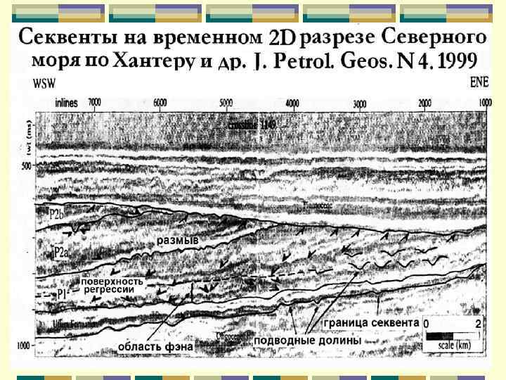 геометрического вида двумерного среза геологических тел, внутренней структуры секвента. При регрессии величина Ēх вблизи береговой линии мала и меняется слабо, так как мал угол β, как следствие, и вектор Ēz при большом [Ūх]. Наклон пластов, это более крупнозернистые породы, относительно мал. при увеличении угла β и относительно большом [Ūх] наклон вектора Ē растёт. Наклон слоёв стремится к максимальному в секвенте. С удалением от берега Ēх снова уменьшается уже из за уменьшения модуля Ūх и наклон слоёв приближается к наклону дна бассейна, и нижняя граница секвента приобретает S - образную форму, её могут осложнять границы размыва, подводные русла и бары. С началом трансгрессии и перехода от тракта спуска на тракт подъёма– «on lap» вектор Ē располагается внутри тупого угла Ēх – Ūz, при этом приобретая почти вертикальную ориентацию. Формируется серия слоёв, почти горизонтальная, и перекрывающая с угловым несогласием, подстилающие слои тракта спуска, которое возрастает с приближением к берегу. При этом вблизи береговой линии может возникнуть единое песчаное тело из разных по времени образования слоёв с различными углами наклона. С наступлением режима стабилизации размеры этого слоевого комплекса могут увеличиваться, но по мере смещения в сторону бассейна толщина отдельных слоёв будет уменьшаться и между ними возникнут глинистые прослои. Такой