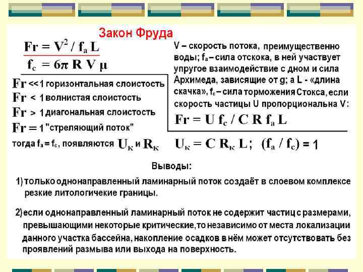 Решение уравнения содержит два слагаемых, причём первое не зависит от времени. Если скорость потока мала, вторым слагаемым можно пренебречь. Тогда крупность осадка будет монотонно снижаться по экспоненциальному закону с увеличением расстояния транспортировки, формируя в результате последовательность осадков нормального литологического ряда от песчаника к глине. При турбулентном потоке на эту зависимость накладывается и периодическая составляющая, в которую будут давать свой вклад время и глубина бассейна. Отсюда следует важный в генетическом плане вывод: если в разрезе фиксируется частое чередование пород разного гранулометрического состава без чётких границ между ними, то это не обязательно должно означать смену условий седиментации и фациальной обстановки. Такая гидродинамическая цикличность всегда имеет