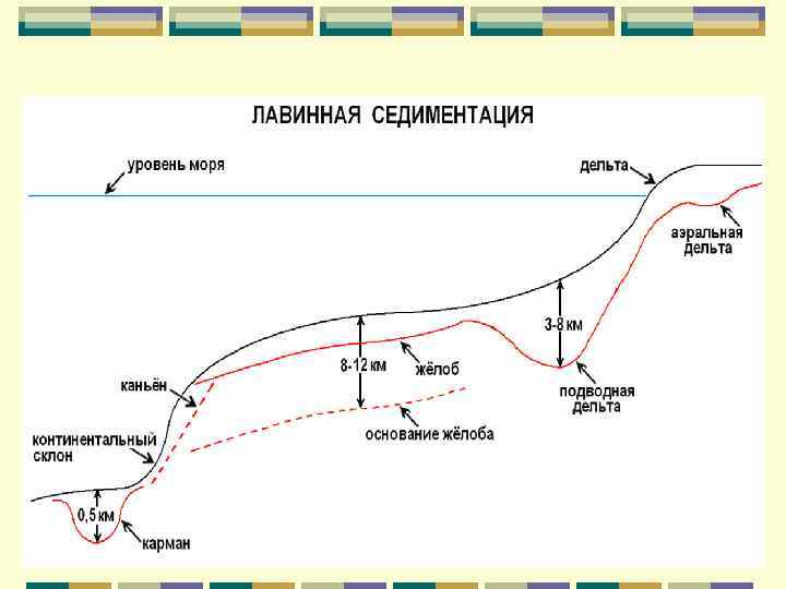 седиментация. Большой фактический материал, существенно изменивший традиционные представления о накоплении осадков, получен за последние десятилетия специалистами в морской геологии. Выяснилось, что основной объём обломочного материала в места седиментации поставляется крупными реками и локализуется при определяющем участии их дельтовых систем. За изобату 3000 м попадает от него только 8%, а средняя толщина всех морских осадков не превышает 160 м. В аккумуляции обломков участвует менее 40% площади дна бассейнов. Скорость накопления осадков крайне неравномерна. В так называемых «областях лавинной седиментации» она может достигать от 1000 до 10000 м за 1000 лет (при 4 м за 1000 лет у побережья Кавказа). К ним относятся и сами дельты, и являющиеся их продолжением на шельфе желоба, протяженностью до многих тысяч километров, а так же участки