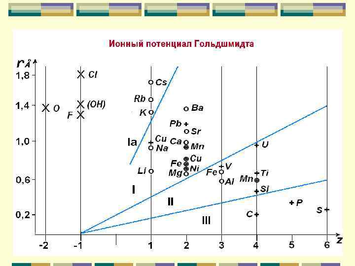 Гольдшмидта, величина которого равна r/z, где r – радиус иона, а z - валентность. Для катионов, относящихся к группе I диаграммы Гольдшмидта, величины ионного потенциала хватает лишь для поляризации молекул Н 2 О в гидратноионном комплексе, на поверхности которого локализуются группы (ОН), придавая раствору щелочную р. Н (щелочные и щёлочноземельные катионы). Они формируют минералы, относительно легко растворимые водой. Ввиду низкого ионного потенциала К+, Rb+, Сs+ не образуют гидратно-ионных комплексов, что не даёт возможность формировать одну сетку из Н 2 О в пространстве между слоями смектита как для Li+ и Nа+, . Это «антистоксовские» катионы, движение их в растворе закону Стокса не подчиняется. Как следствие, при химической близости Nа+ и К+ они являются геохимическими антиподами: К+ «не доходит» до бассейнов, а Nа+ главным образом накапливается в океанах и эвапоритах. Для