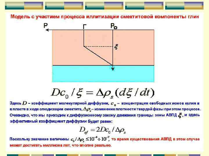 Процесс формирования АВПД очевидно начинается с приходом в пласт-коллектор водо-углеводородного флюида который запускает реакцию биохимического разложения породообразующих силикатов, прежде всего – КПШ. В свободный объём пор покрышки поступает обогащённый калием и глинозёмом раствор, что обеспечивает заторможенную ранее трансформацию компоненты смектита в иллит для смешанослойной фазы иллит-смектит. Этот процесс сопровождает переход молекул Н 2 О из межслоевого пространства смектита в поры, что ведёт к резкому увеличению общего объёма жидкости в системе и, при наличии газовой фазы, к росту пластового давления. За счёт появления механических напряжений в нижней части покрышки возникают новые трещины. По ним продолжается фильтрация флюида, сопровождаемая нарастанием всех названных явлений, и процесс приобретает лавинообразный характер. Гидродинамический порог смещается вверх по разрезу,