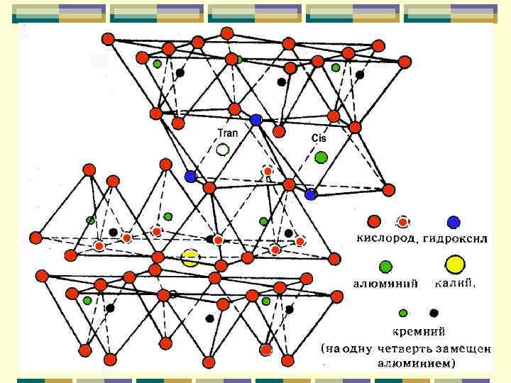 В межслоевом пространстве смектита они координируют две сетки молекул Н 2 О. Из трёхвалентных катионов наибольший интерес для нас представляет Al. Являясь амфотером, он в кислой среде выступает как Al 3+, а при щелочных р. Н создаёт комплекс Al(OH)2 -, который в межслоевых промежутках смектита может формировать соединения переменного состава с разным количеством групп (OH) и молекул воды. В предельном случае возникает сетка октаэдров состава Al(OH)3 , отвечающая по структуре гиббситу. Катионы с более высокой валентностью присутствуют в растворе только в виде комплексов CO 3, SO 4, PO 4 и. т. д. Во всех случаях поверхность минерала имеет заряд, вызывающий притяжение ионов противоположного знака, и на границе раздела твердой фазы и раствора возникает электрический потенциал, формирующий двойной электрический слой - ДЭС, состоящий из слоя ионов определяющих потенциал и слоя ионов, этот