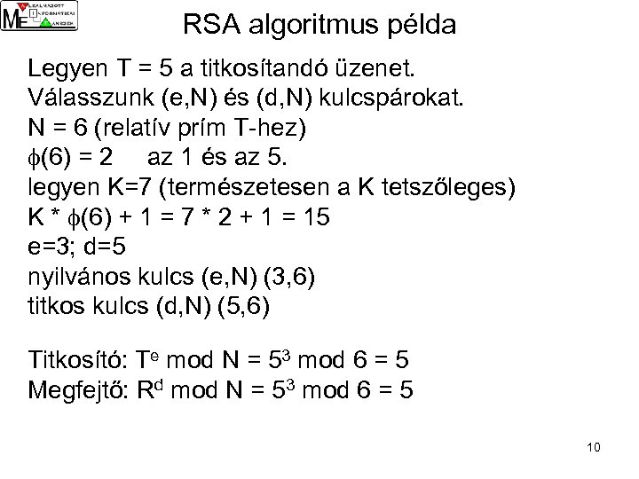 RSA algoritmus Alaptétel: T N -1 mod N = 1 - ha N>T és N prímszám, akkor az egyenlet teljesül § f(N) jelölje azt, hogy N-nek hány relatív prímje van. § pl: f(9) = 6 mégpedig (1, 2, 4, 5, 7, 8) f(11) = 10 (1, 2, 3, 4, 5, 6, 7, 8, 9, 10) § prímek esetén f(N) + 1 = N T T f(N) mod N = 1 Kf(N)+1 mod N = 1 T Kf(N)+1 mod N = T ahol K tetszőleges egész és Kf(N)+1 felbontható két egész szám szorzatára 9